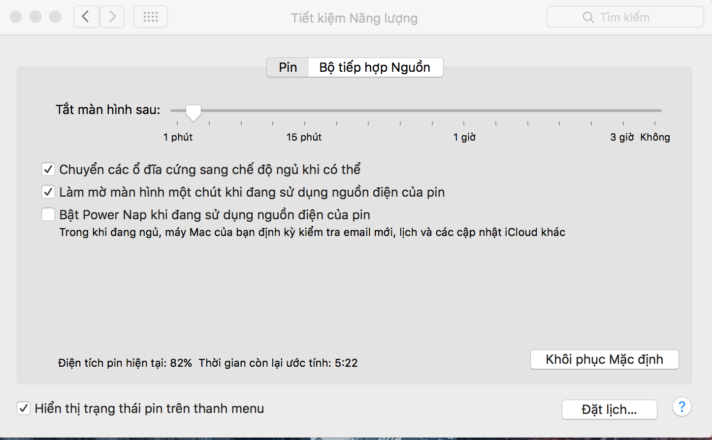 Bật chế độ tiết kiệm pin lên bằng cách trỏ chuột lên thanh menu bar-> click vào open energy saver preferences ( mở tuỳ chọn tiết kiệm năng lượng). Sau đó bạn chọn các ứng dụng mà mình thấy cần