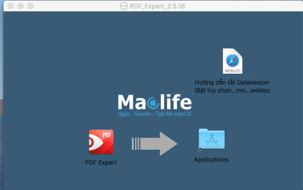 Bạn chỉ việc kéo file "PDF Expert" sang Folder Applications để tiến hành cài đặt và sử dụng ( phần mềm đã crack sẵn bạn chỉ cần skip khi hỏi đăng nhập email)